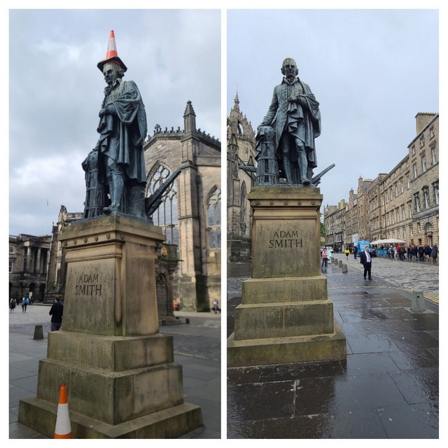 애덤스미스 머리 위에 칼라콘(주차/입장금지 등에 쓰이는 주황색 표지)이 씌워져 있었다.-(정말로 사진처럼~~)