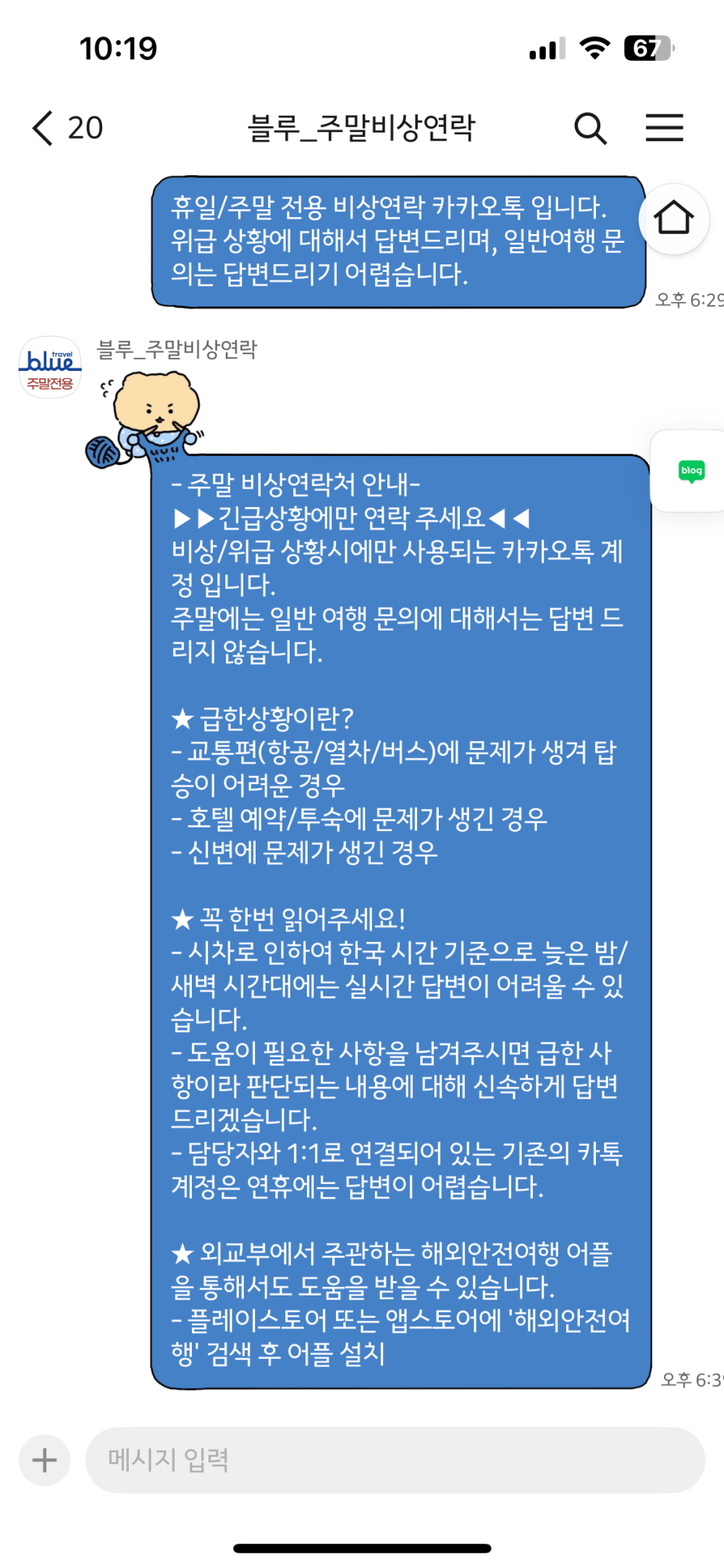 긴급하게 병원이나, 항공, 숙박에 문제있을때 연락할수 있는 라인이 따로 생겼다.