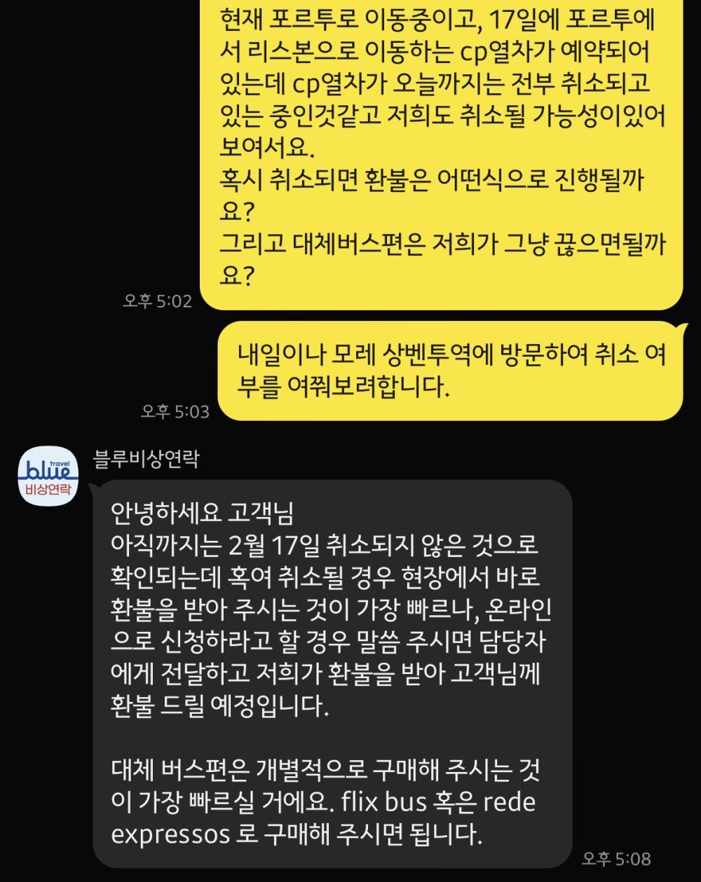 심지어 그때가 한국은 설 연휴라서 이걸 어떻게 해야하나 엄청 걱정했는데, 다행히 젊은여행사블루 비상연락처가 있어서 그쪽으로 연락드렸고